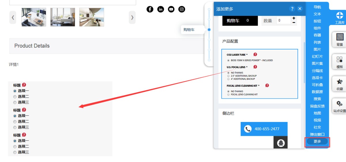 8,在母版管理-产品内页里拖入产品配置控件,放到指定位置。