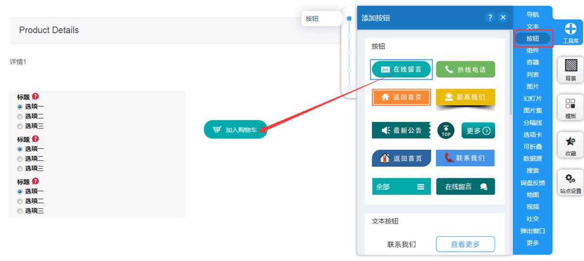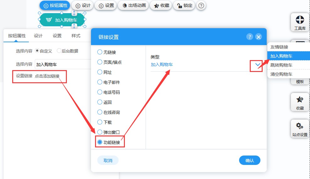 10,在按钮属性,设置链接里,选择功能链接-加入购物车。