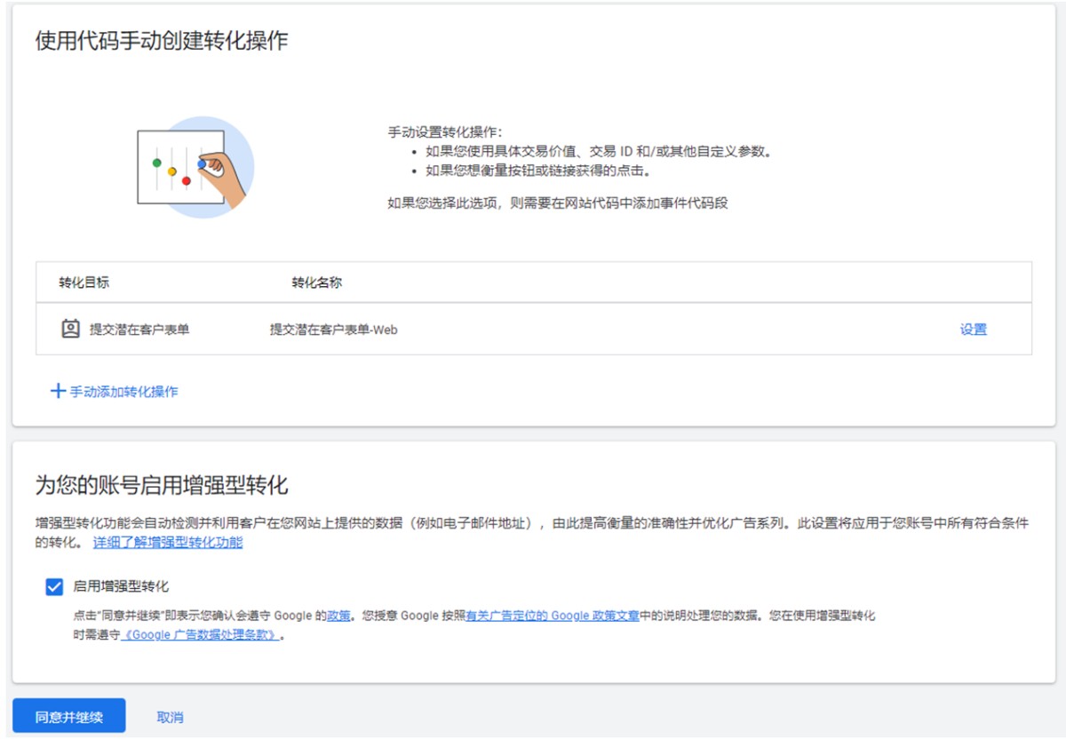 4、点击“手动添加转化操作”。