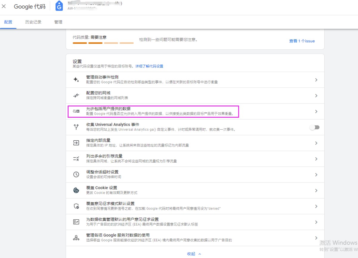 填写全局代码的ID:AW-XXX......(第九步的截图里的全局代码ID)。