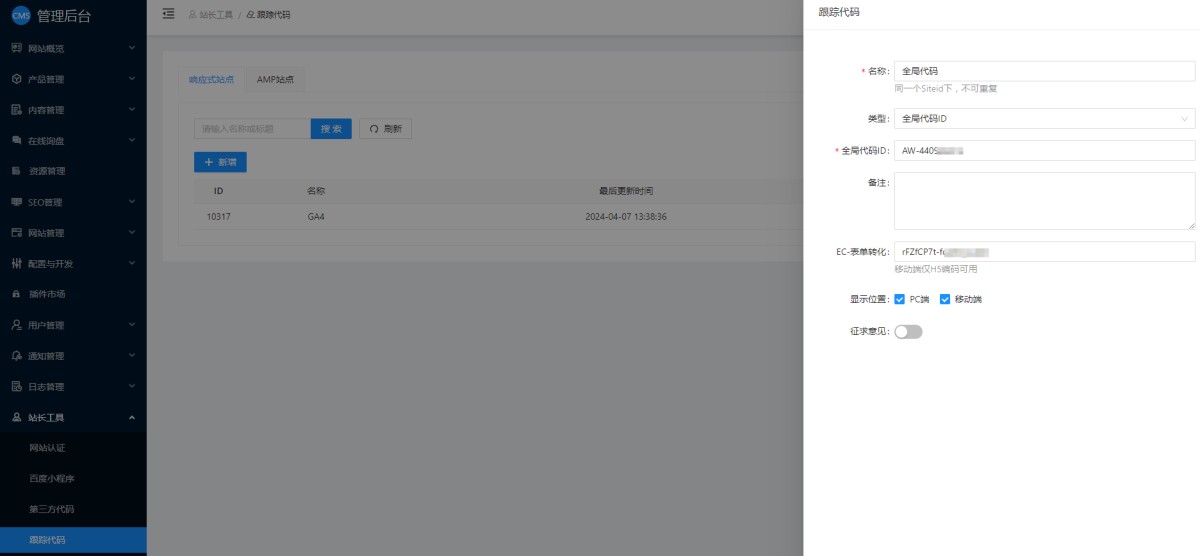 17、进入网站的CMS管理后台。在站长工具-跟踪代码里点击新增,添加GA4代码。添加后保存。