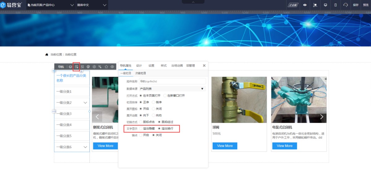 溢出换行:即文字长度超出导航长度时,超出的文本会换行显示。(设置换行后,注意调整一下文本的行高,在“设计-T”里调整。)