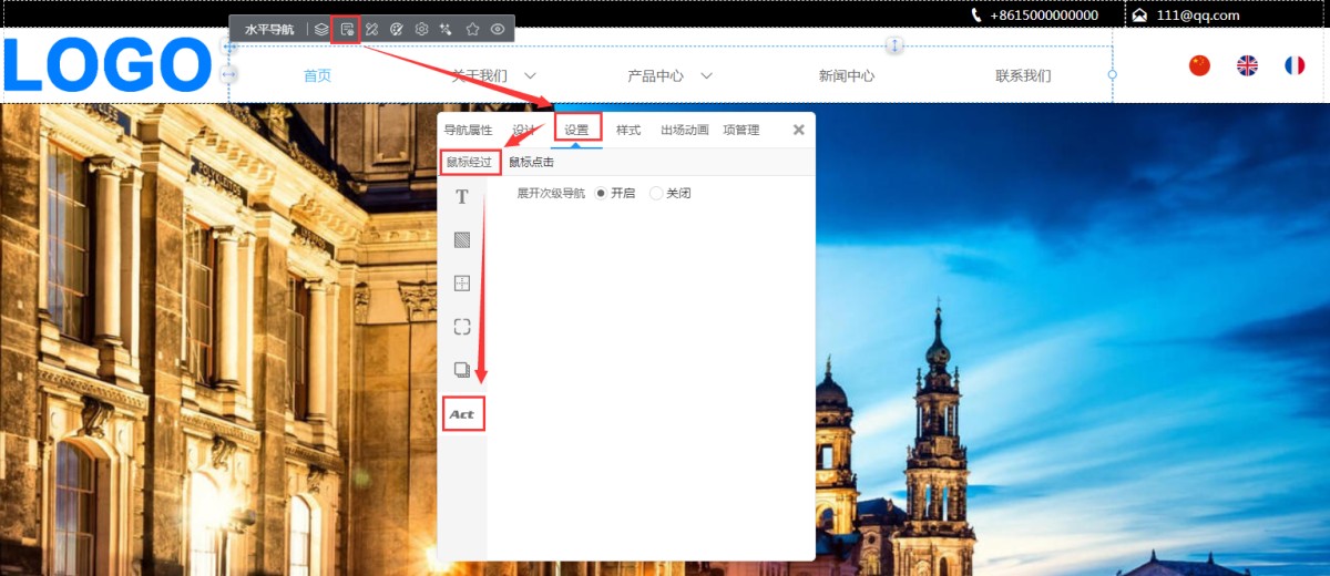 2,鼠标经过一级导航时展开次级导航,设置方式如下: