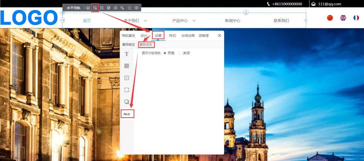 在导航属性-设置-鼠标点击-Act里,展开次级导航选“开启”即可。