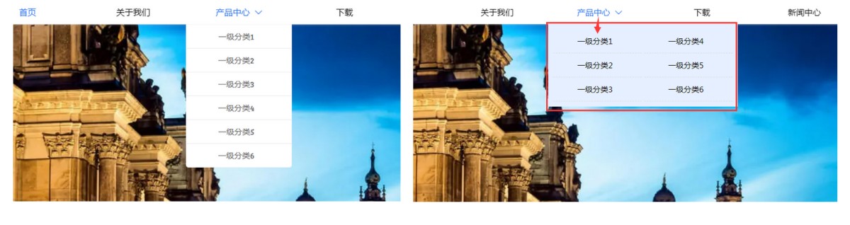 我们常见的次级导航样式是下拉一列展示的(如下左图)。但是如果客户的次级栏目比较多,下拉一列展示的很长,会影响美观,就可以考虑设置多列展示(如下右图)。