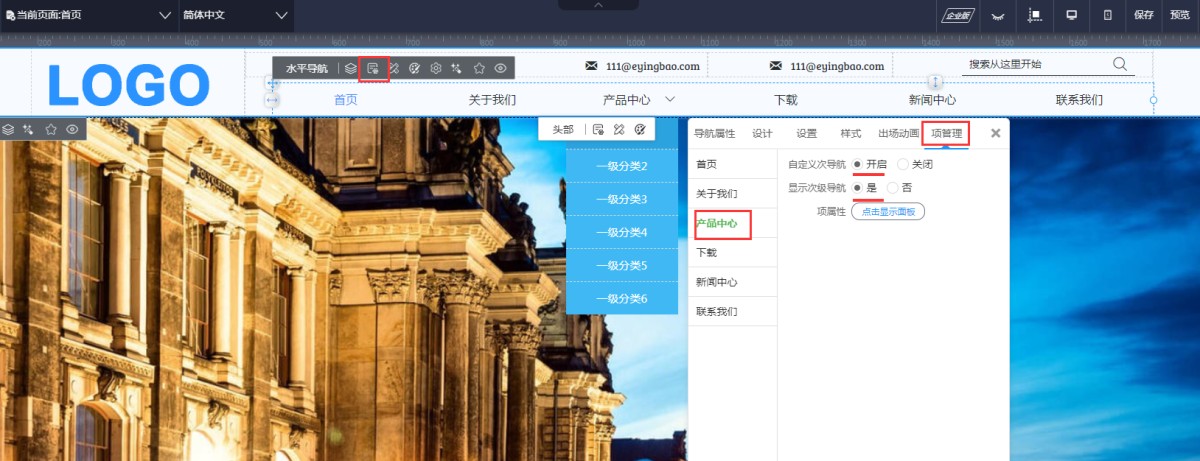 1,在导航属性-项管理里,给一级导航开启自定义导航并开启显示。