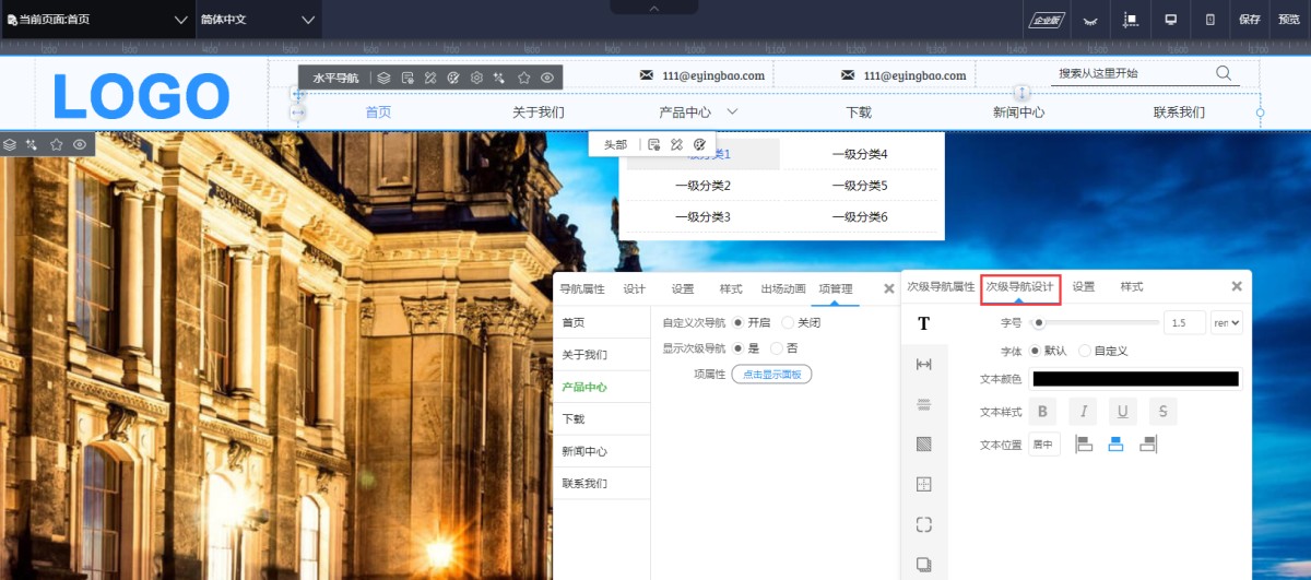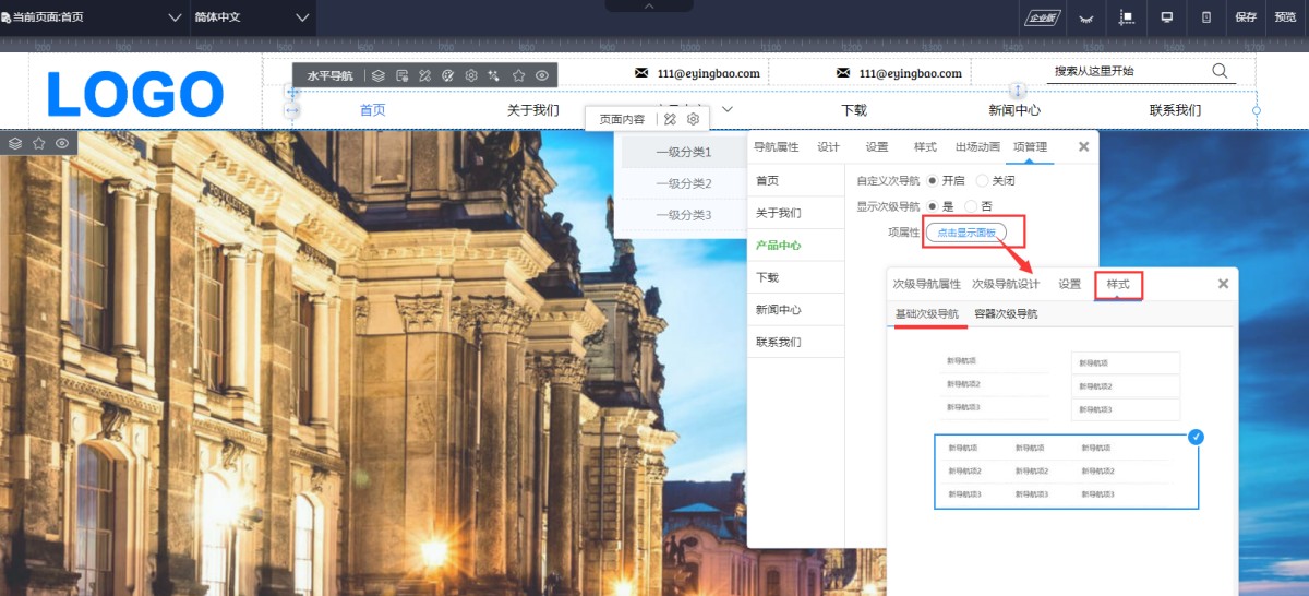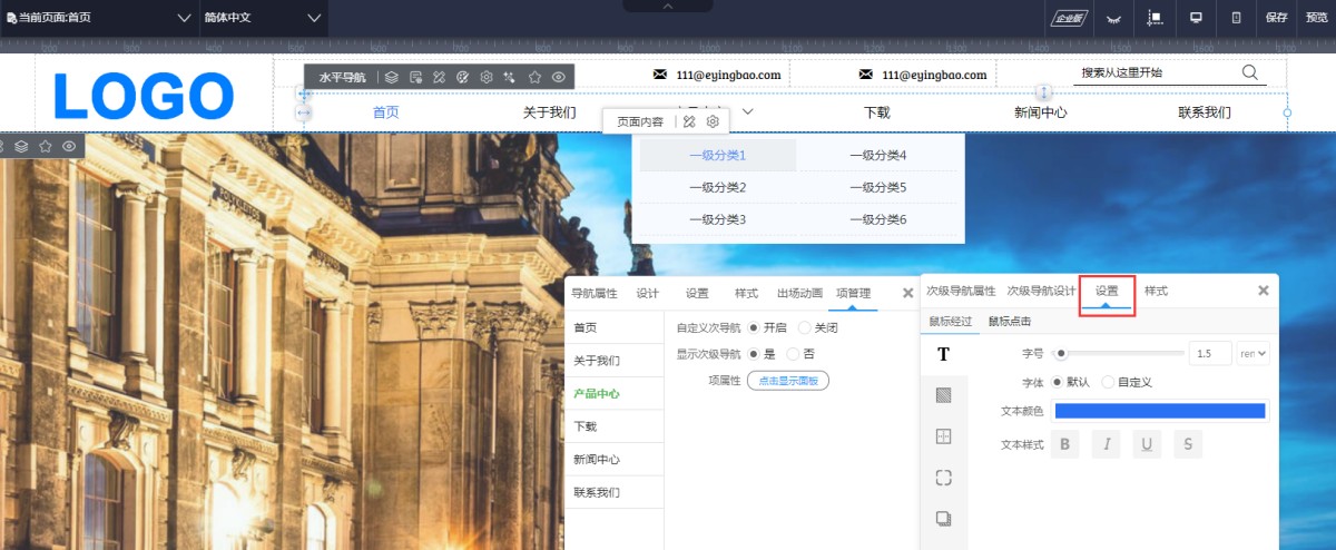 5,在次级导航属性设置里,可以设置鼠标经过和鼠标点击次级导航时的样式,包含文本样式、背景色、边框、阴影、圆角等