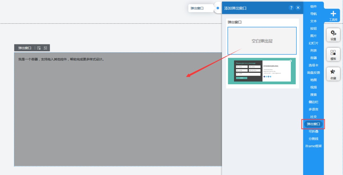 1,从工具库里选择弹出窗口控件,拖入到页面上。