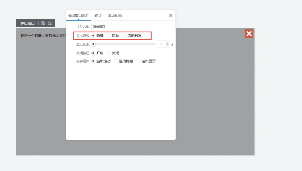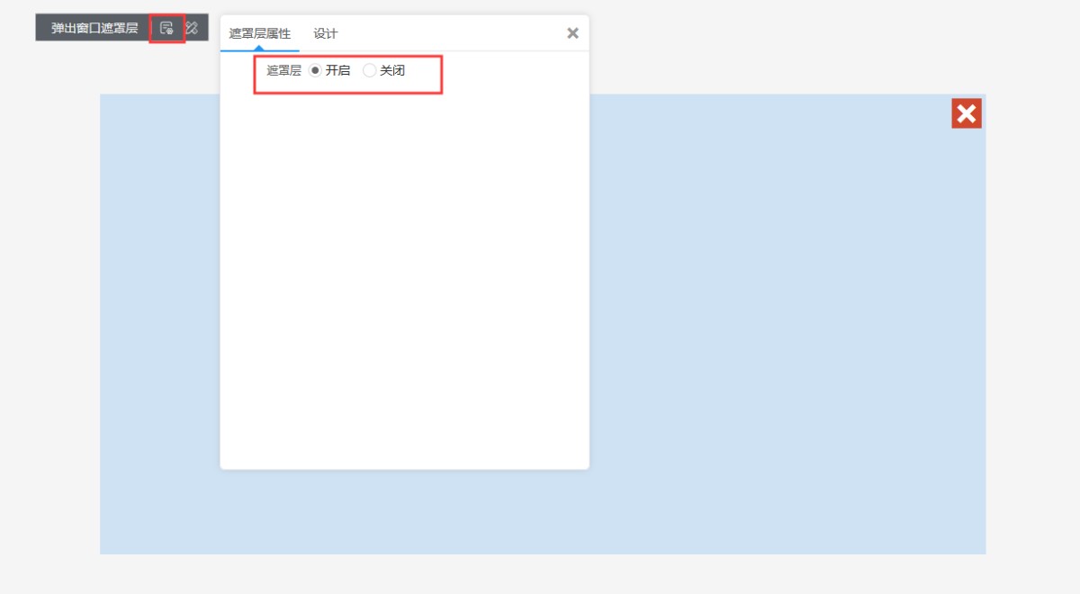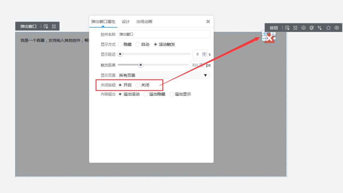5,弹出窗口自带关闭按钮,可以设置是否显示。选择开启后,在弹出窗口的右上角会显示关闭按钮,点击按钮会显示按钮属性,可以设置按钮的样式。