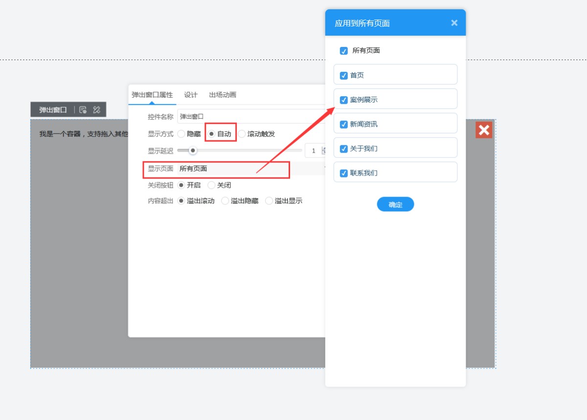 3,显示方式选择“自动”,是指弹出窗口自动弹出,可以设置弹出显示的延迟时间和在哪个页面弹出。
