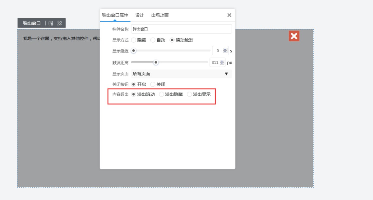 溢出显示:即内容的高度大于弹出窗口的高度时,超出的内页会在弹出容器外正常显示(此种情况多用于弹出容器里加导航控件,当次级导航展开时,整体高度大于弹出容器高度。设置溢出显示,次级导航可以正常显示出来。)