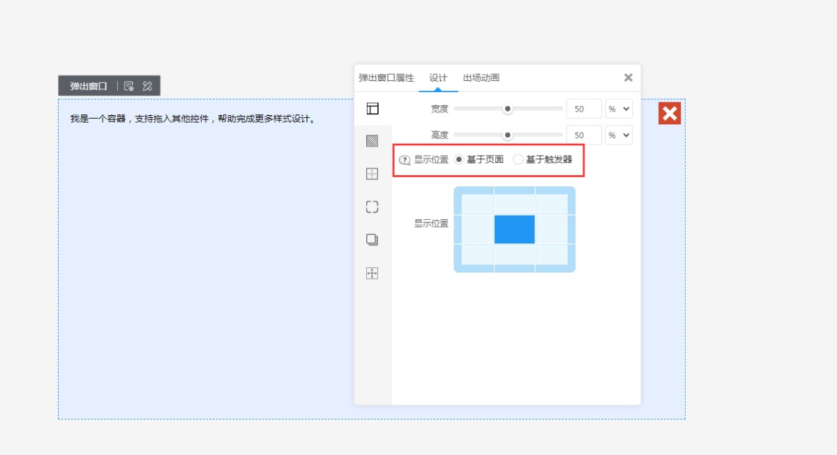 8,其中显示位置这里,有个选择,是基于页面弹出,或者基于触发器弹出。