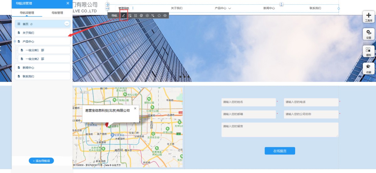 2,点击属性里的管理导航,可以打开导航管理界面,可以添加和删除导航项,也可以修改导航名称。