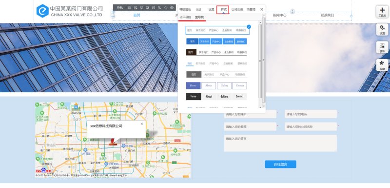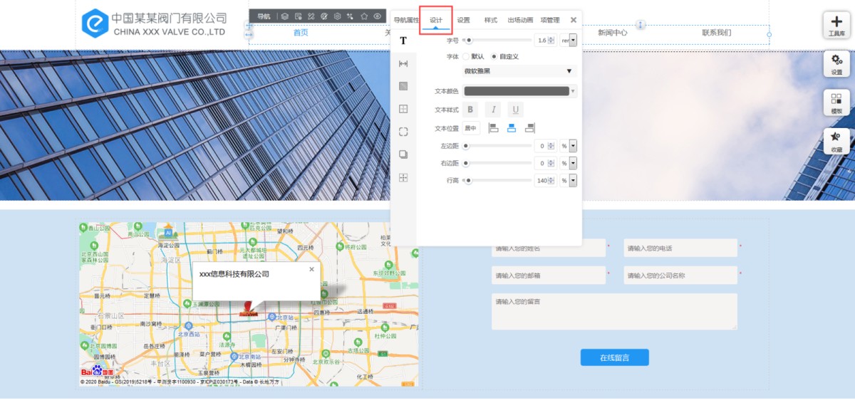 6,在“设计”里,可以修改导航的文字,间距,背景色,边框,阴影,定位等。