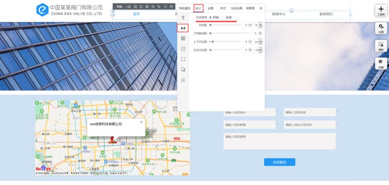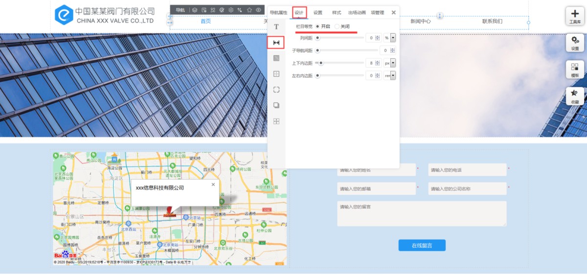7,在“设计-间距”间距,可设置导航栏目等宽,并设置列间距。考虑到导航在小屏电脑上的展示效果,建议选等宽,间距设置0。