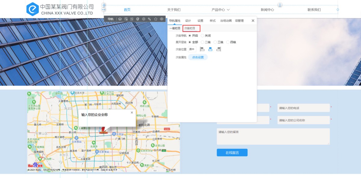 4,在次级栏目属性里,可以设置是否显示次级导航、次级导航展开的层级、设置次级导航的位置。注意:次级导航的位置建议选居中,即和一级栏目居中对齐。
