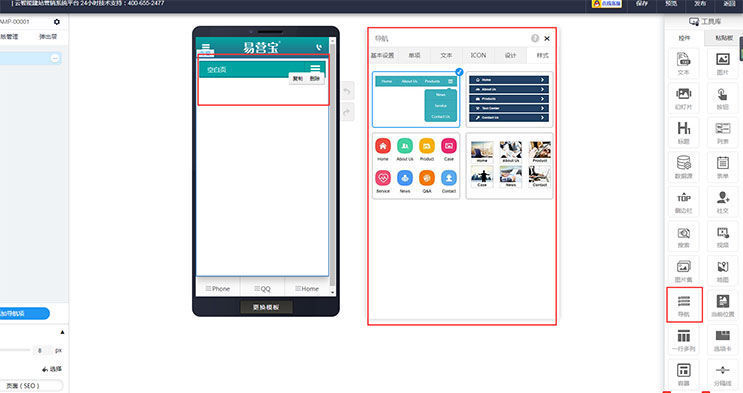 在页面编辑里拖入导航控件,默认显示样式,目前有四种样式可以选择,在页面里选中搜索控件,可以复制和删除。