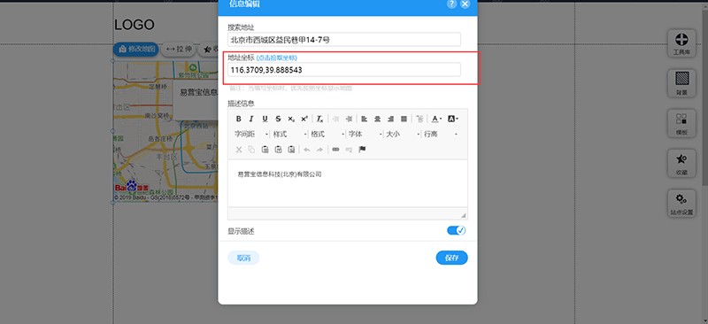 1、修改地图:设置地图相关属性,选取坐标点击地址右侧图标,进入地址拾取页面。