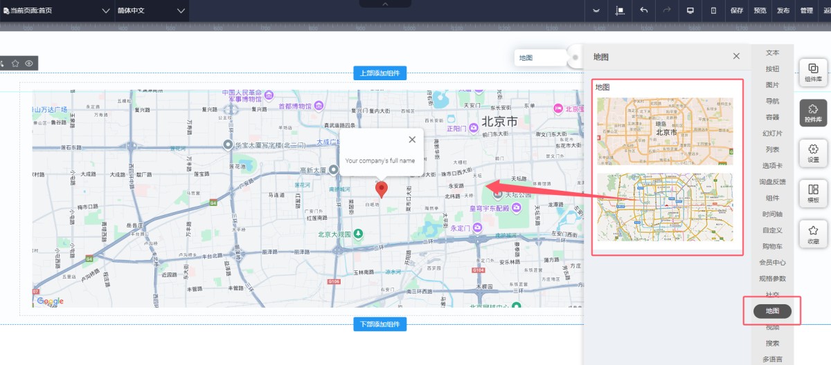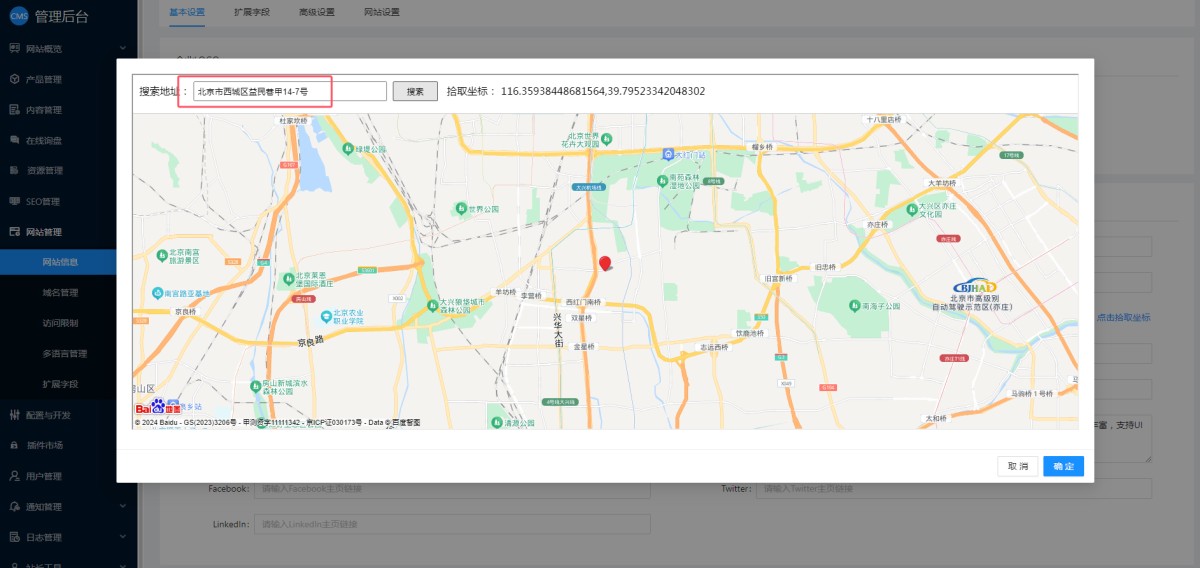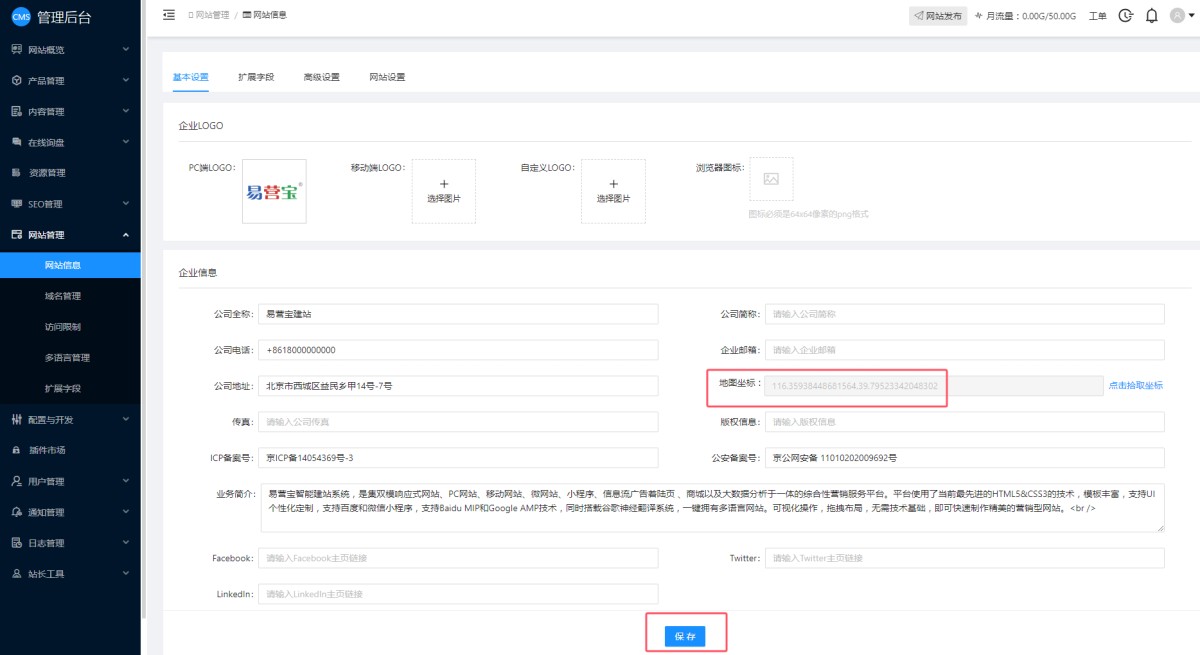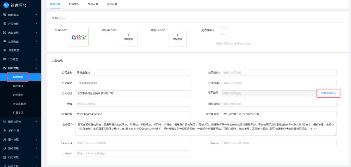 1,在CMS管理后台网站管理-基本信息里,先设置地图坐标,点击拾取坐标。