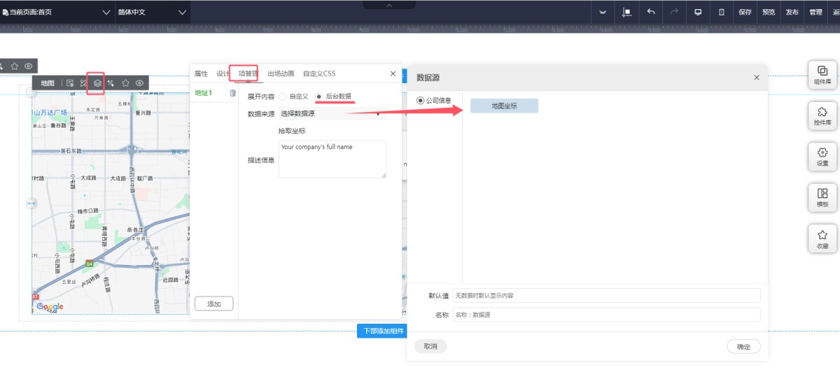 5,在地图控件属性-项管理里,选择后台数据,数据来源选地图坐标,点击确定即可。