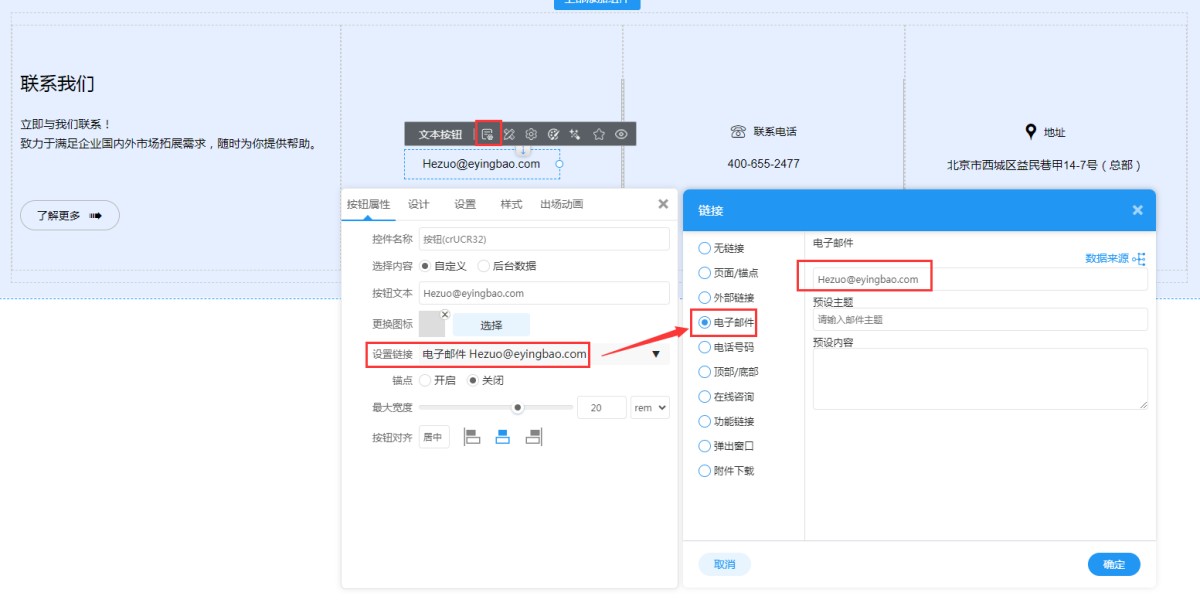 在按钮或文本属性里,点击设置链接,在弹窗里选择电子邮件,输入邮箱地址即可。