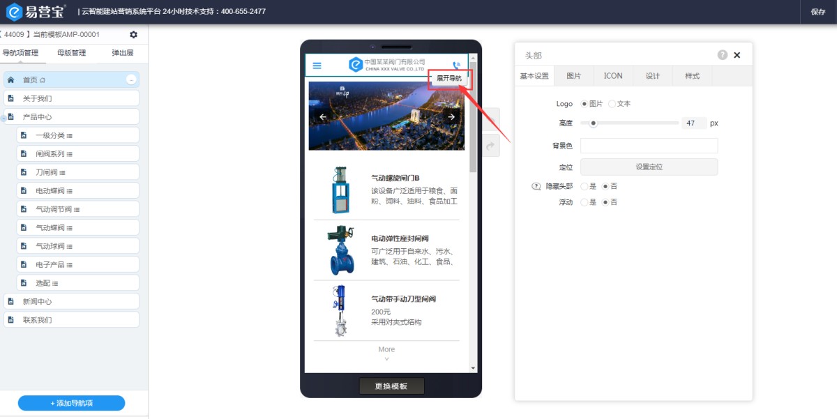 1,在AMP/MIP的UI编辑页面,点击头部区域,会显示一个“展开导航”按钮,点击“展开导航”。