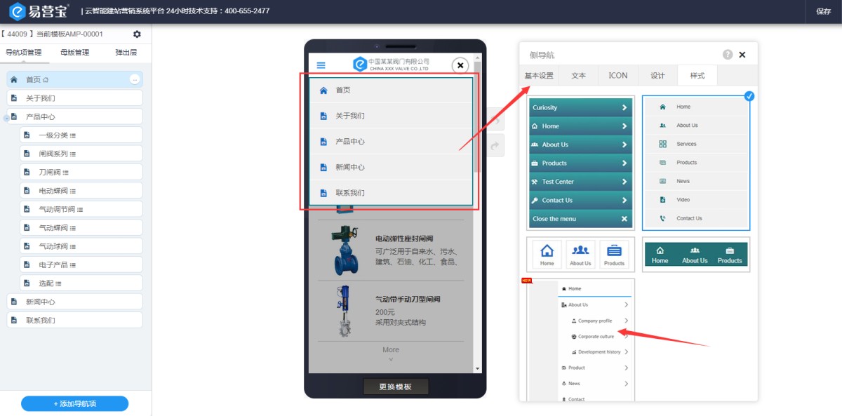 2,点击导航区域,会显示出侧导航的属性,其中第五个样式是可以展示次级导航的。(样式1-4,只支持展示一级导航)