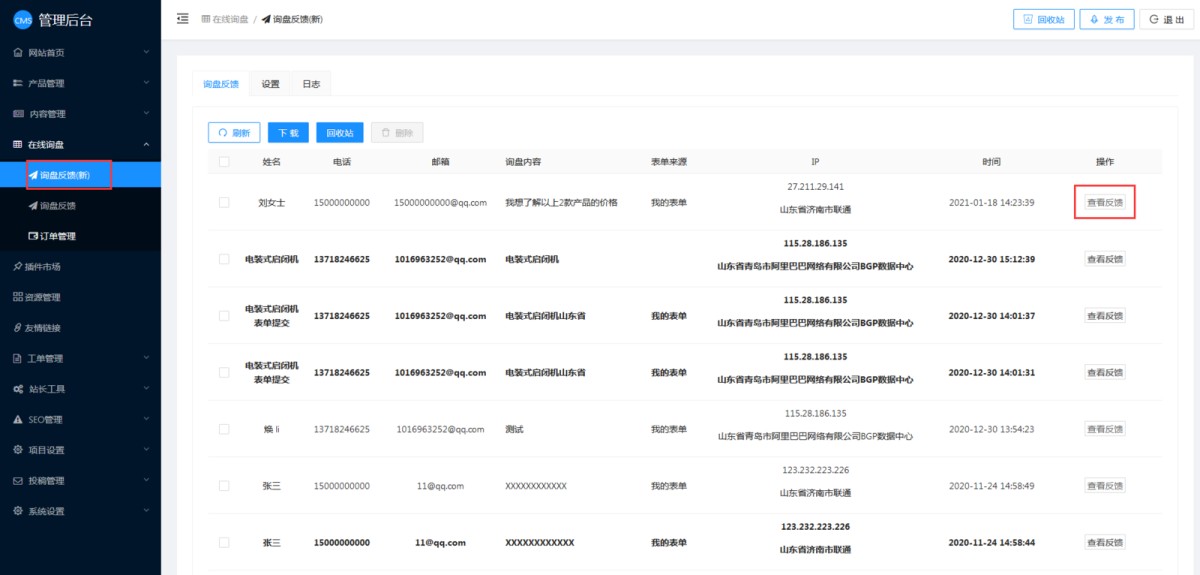 1,在管理后台查看:在CMS管理后台-在线询盘-询盘反馈里查看,点击“查看反馈”可以查看留言的详细内容。