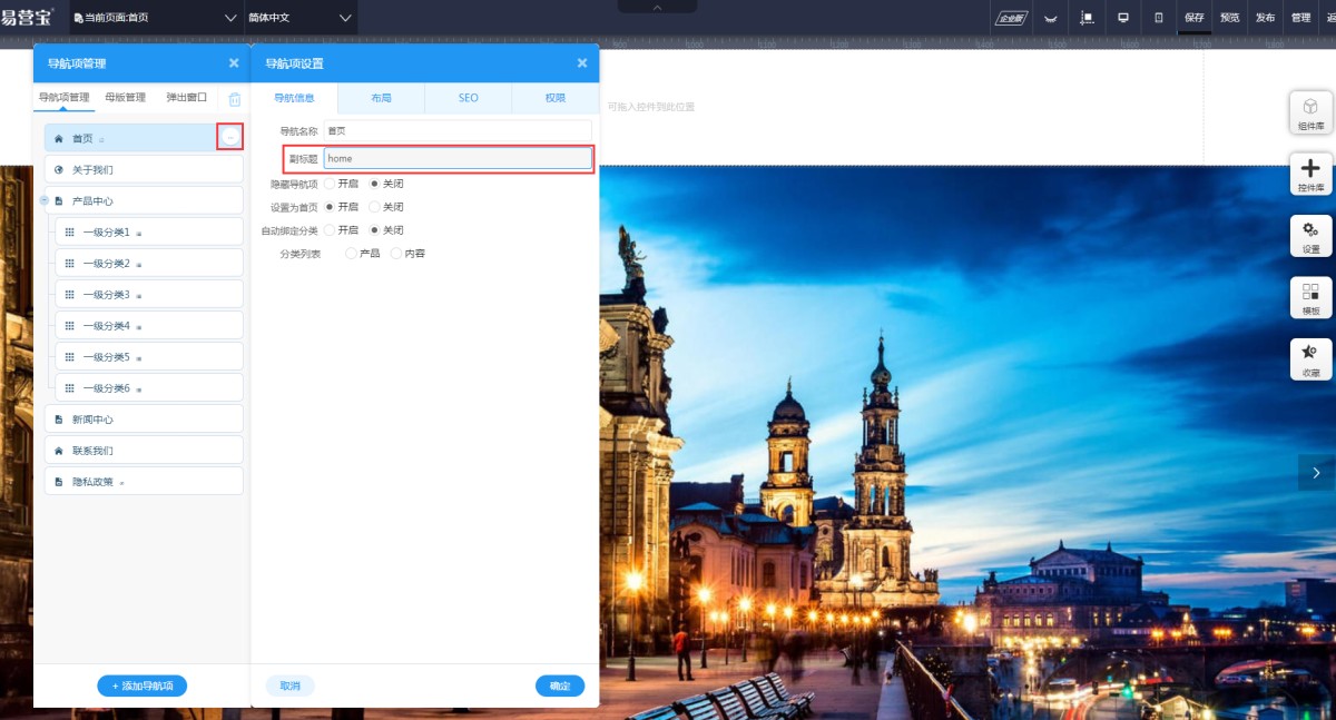 4,导航其他属性设置,如背景色、次级导航设置等,同普通导航一样,具体操作可以参考:https://help.eyingbao.com/products/daohang_3120.html