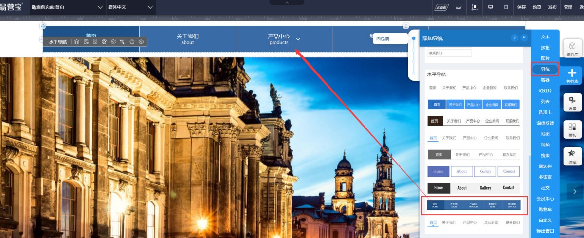 2,在控件库-导航里,选择带副标题的导航样式,添加到头部区域。