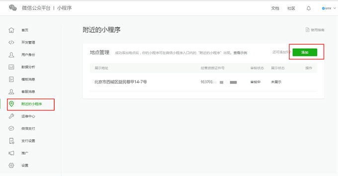 1,登录小程序后台,进入“附近的小程序”,点击添加地点管理。