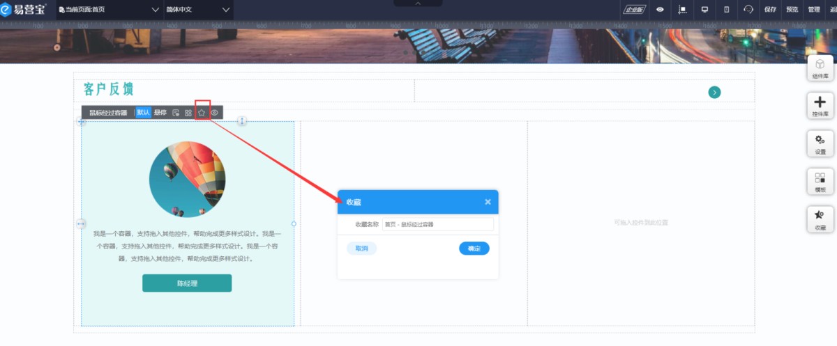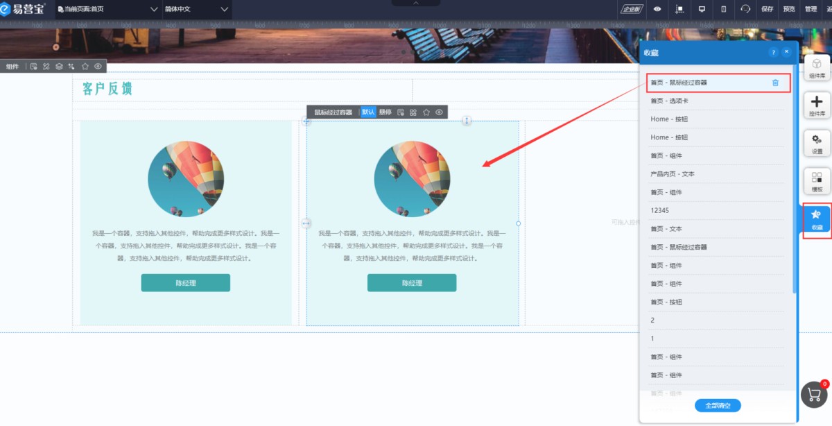 2,在编辑页面右侧,有个收藏夹,打开后可以看到所有收藏的控件,选中控件拖入到页面上即可。