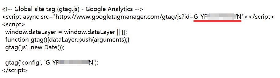 1,Google Analytics 4 代码(简称GA4),代码或ID由谷歌客服提供,在易营宝建站后台只需添加ID。如果谷歌客服提供的是代码,如下图,其中横线部分是GA4的ID。