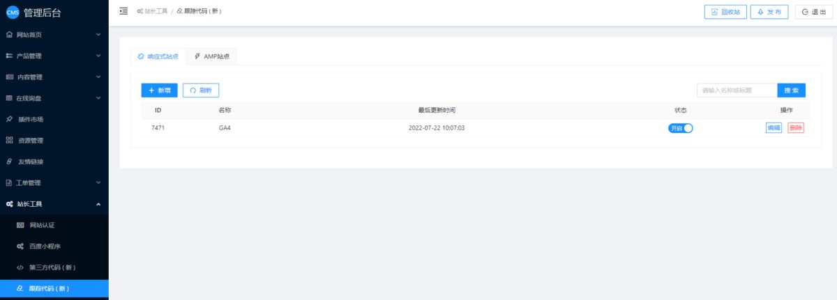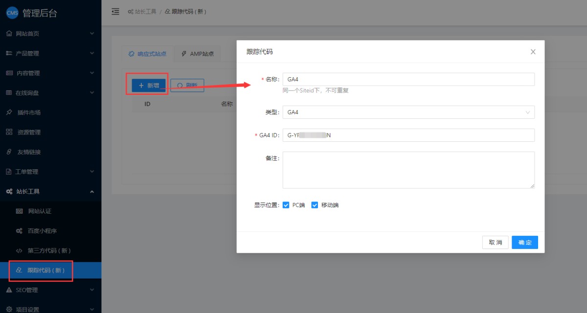 2,在网站CMS管理后台,站长工具-跟踪代码里,点击“新增”。在弹出窗口填写代码信息,然后保存即可。