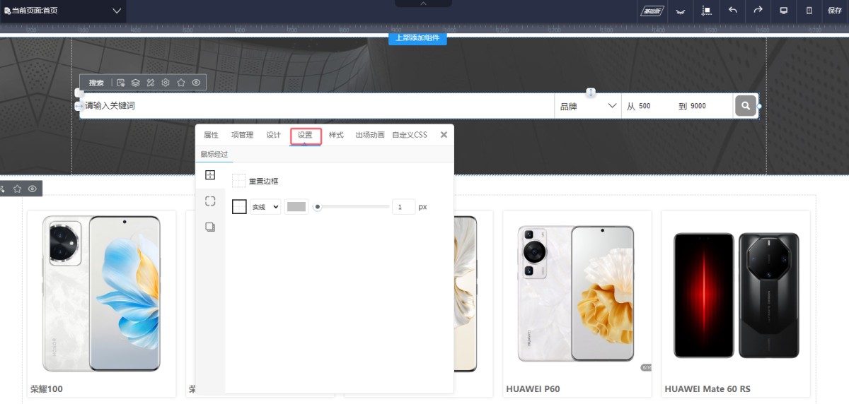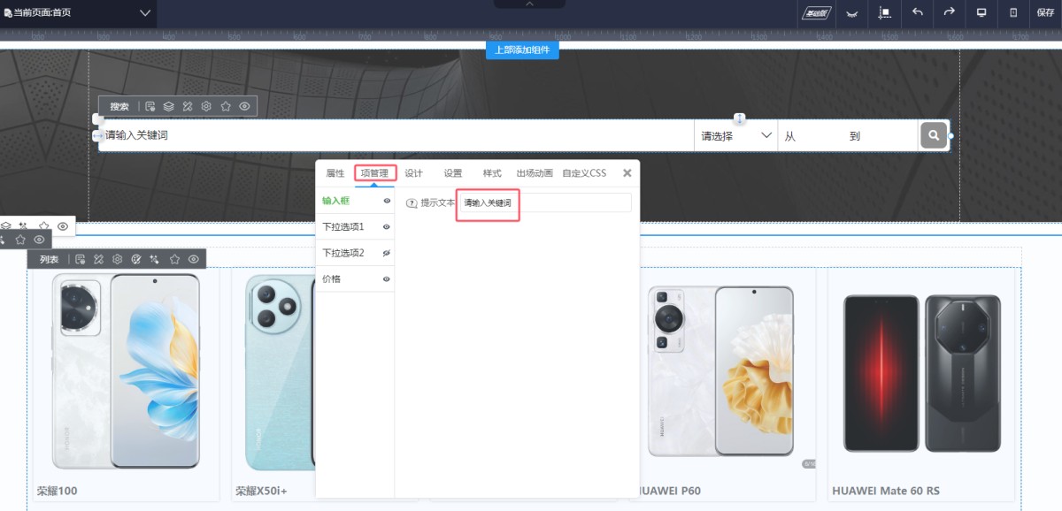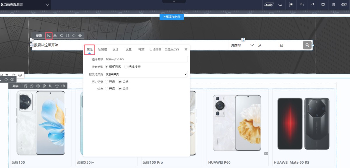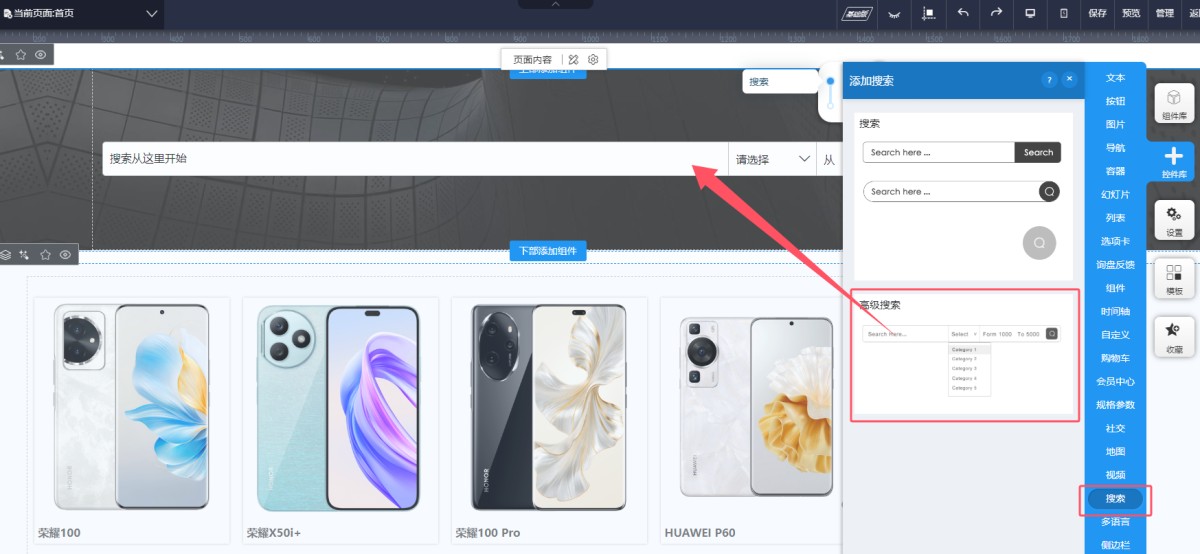 1,从控件库里选择高级搜索,拖入到页面上。