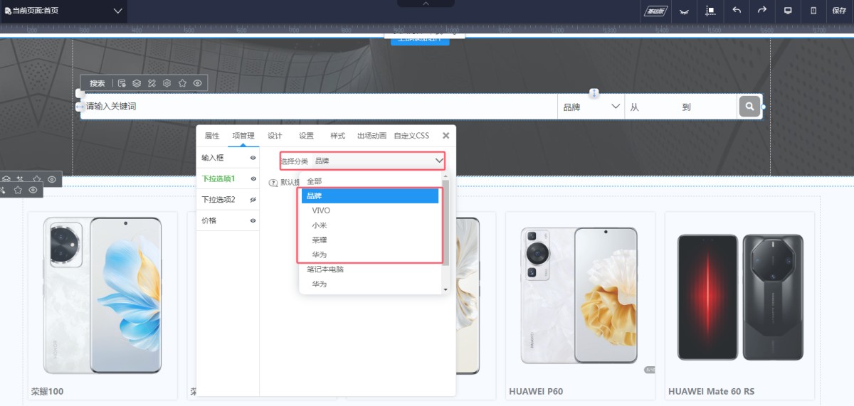 4,系统提供两个下拉选项,作为搜索类别的选择。在项设置里,可以选择分类。选择某一个分类后,该分类的次级则为下拉框的选项。例如下图,客户产品一级分类是品牌,二级分类是各品牌名称,那么可以选择选择品牌这个一级分类作为搜索条件,品牌名称就会自动成为该下拉框的选择项。