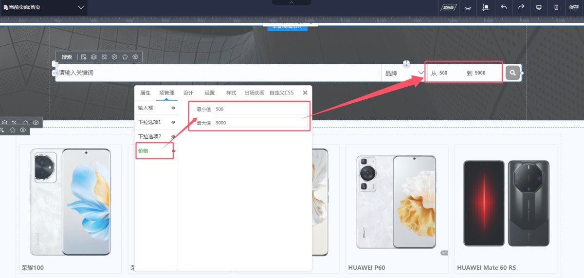 6,在价格这一项上,可以设置产品的价格范围的提示,包括最小值和最大值。