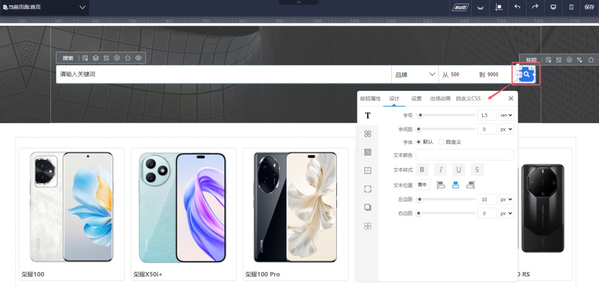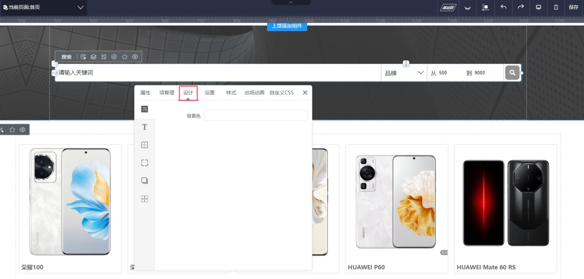 8,在“设计”里,可以设置搜索控件的样式,包含背景色,文本样式,边框,圆角,阴影和间距等。