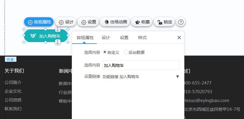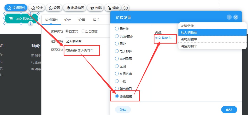 3,在按钮的设置连接里,选择“功能连接-加入购物车”。