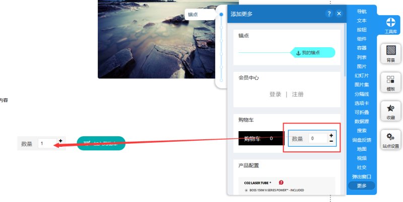 4,如需设置加入购物车的数量,可以在“工具库-更多”里选择数量控件,添加到页面上。