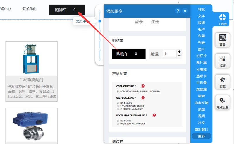 7,除了产品详情页完,普通导航页上,可以添加一个进入购物车的按钮,方便客户随时进入购物车查看已添加的产品。在“工具库-更多”里,拖入购物车控件到页面指定位置即可。一般是加到头部,这样客户可以在任何一个页面看到此按钮,点击可进入购物车页面。