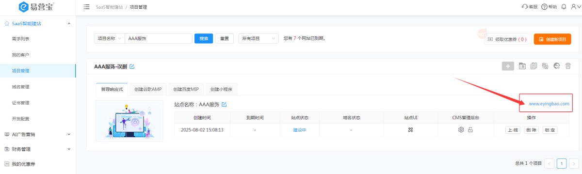 1,在项目管理里找到网站,点击项目上的访问链接。