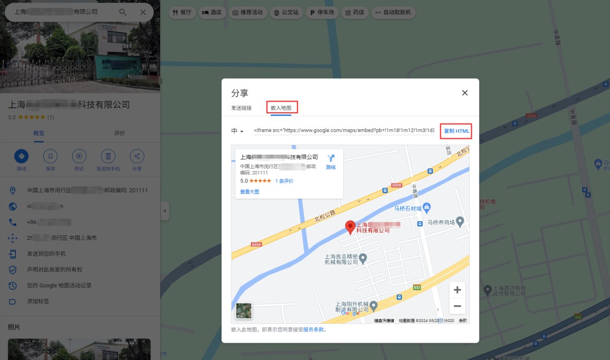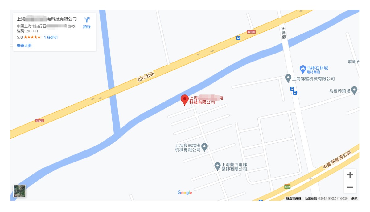 说明:只有在谷歌地图上做过标注的企业或商户才可以使用此功能,显示样式如下,地图上会包含公司名称、地址、评价、导航等功能。