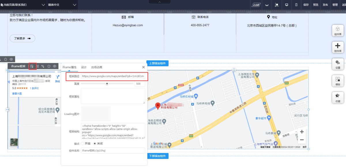 6,在iframe属性-框架路径里,把第四步获取的链接粘贴进去。最后可以根据排版需求调小高度即可。