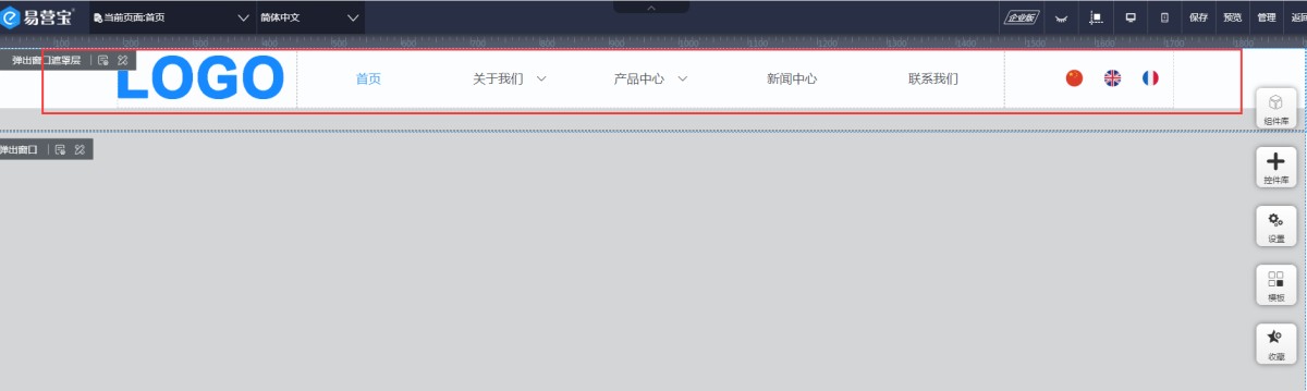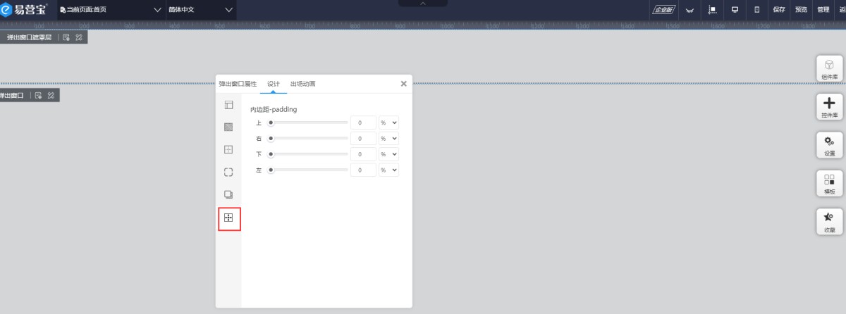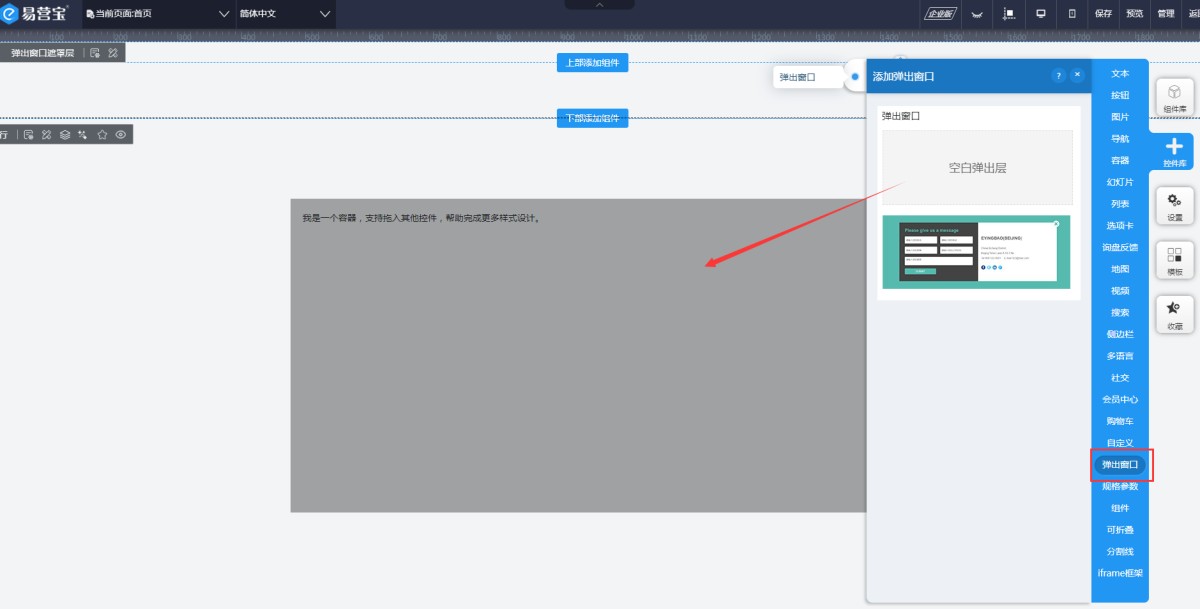 1,从控件库里选择弹出窗口,拖拽添加到页面上。