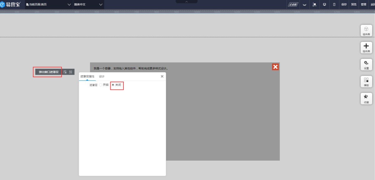 2,点击空白区域,会显示遮罩层属性,选择关闭遮罩层。