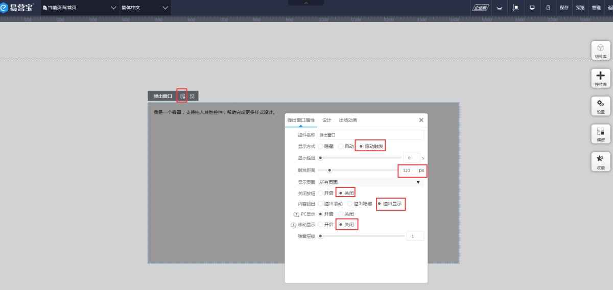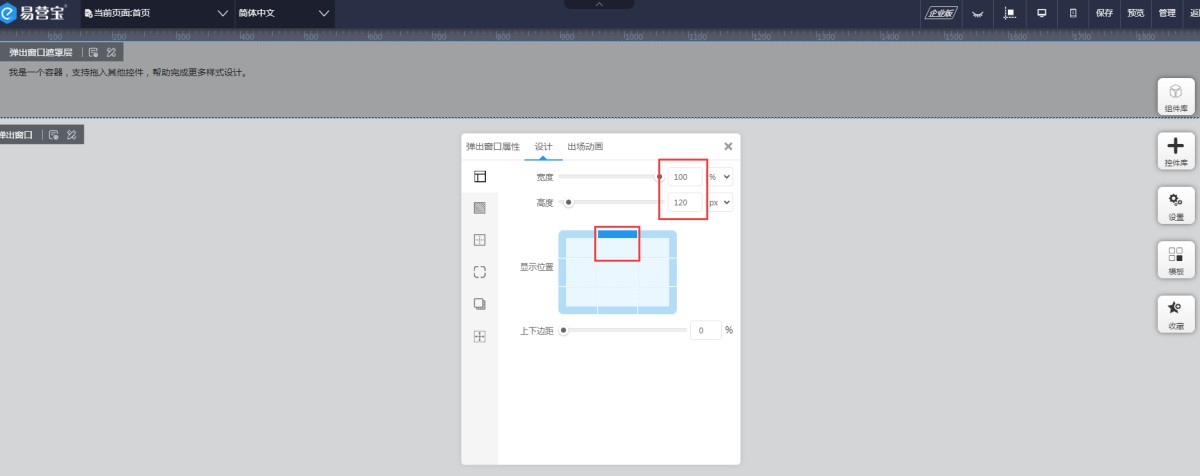 4,在弹出窗口设计里,宽度选择100%。高度可根据头部区域的高度设置,比如120PX。显示位置选居上。