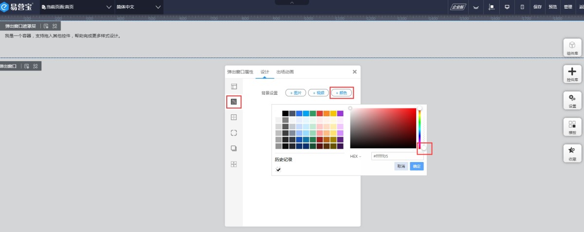 5,在背景色设置里,将弹出窗口的背景设置成透明色。