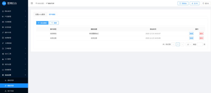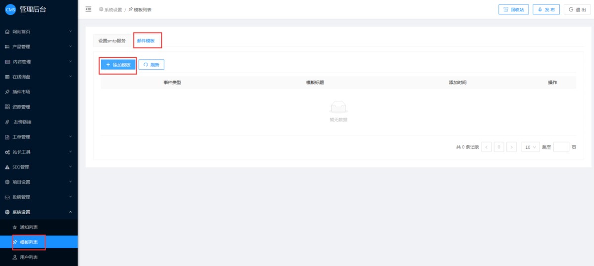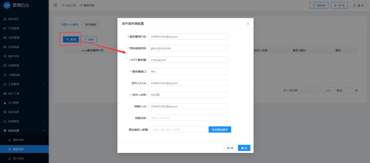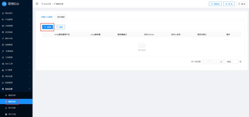 4,进入CMS管理后台,点击系统设置-模板列表-设置smtp服务-新增。