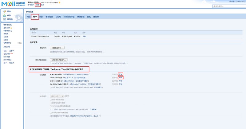 1,以QQ邮箱为例,登录QQ邮箱后,点击设置-账户,找到“POP3/IMAP/SMTP/Exchange/CardDAV/CalDAV服务”。开启POP3/SMTP服务和IMAP/SMTP服务。